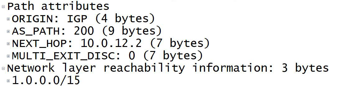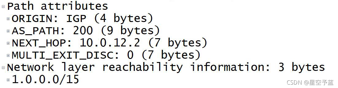 网络层可达信息(Network Layer Reachability Information)域:表示含有匹配相同属性的路由信息。当此字段为0时,表示为缺省路由