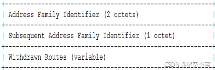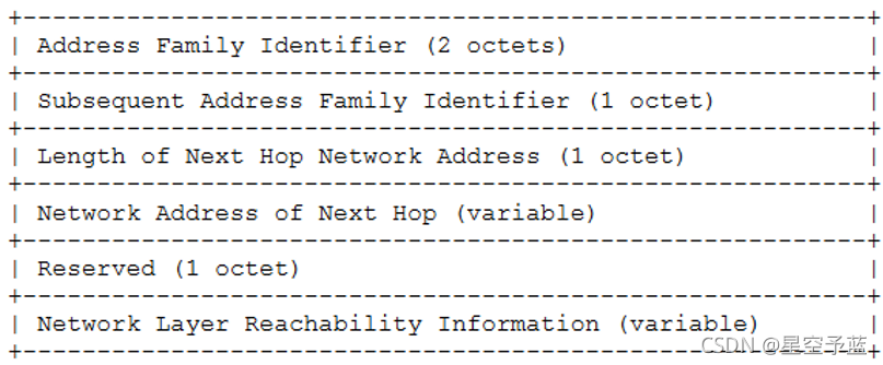 地址族信息(Address Family Information)域:由2字节的地址族标识AFI(Address Family Identifier)和1字节的子地址族标识SAFI(Subsequent Address Family Identifier)组成