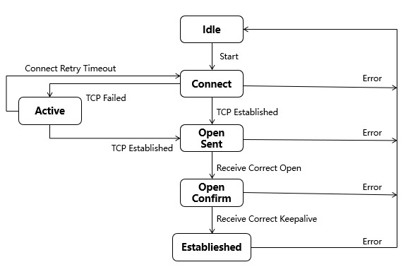 任何状态中收到Notification报文、TCP拆除链路通知、TCP连接断开等Error事件后,BGP都会转至Idle状态