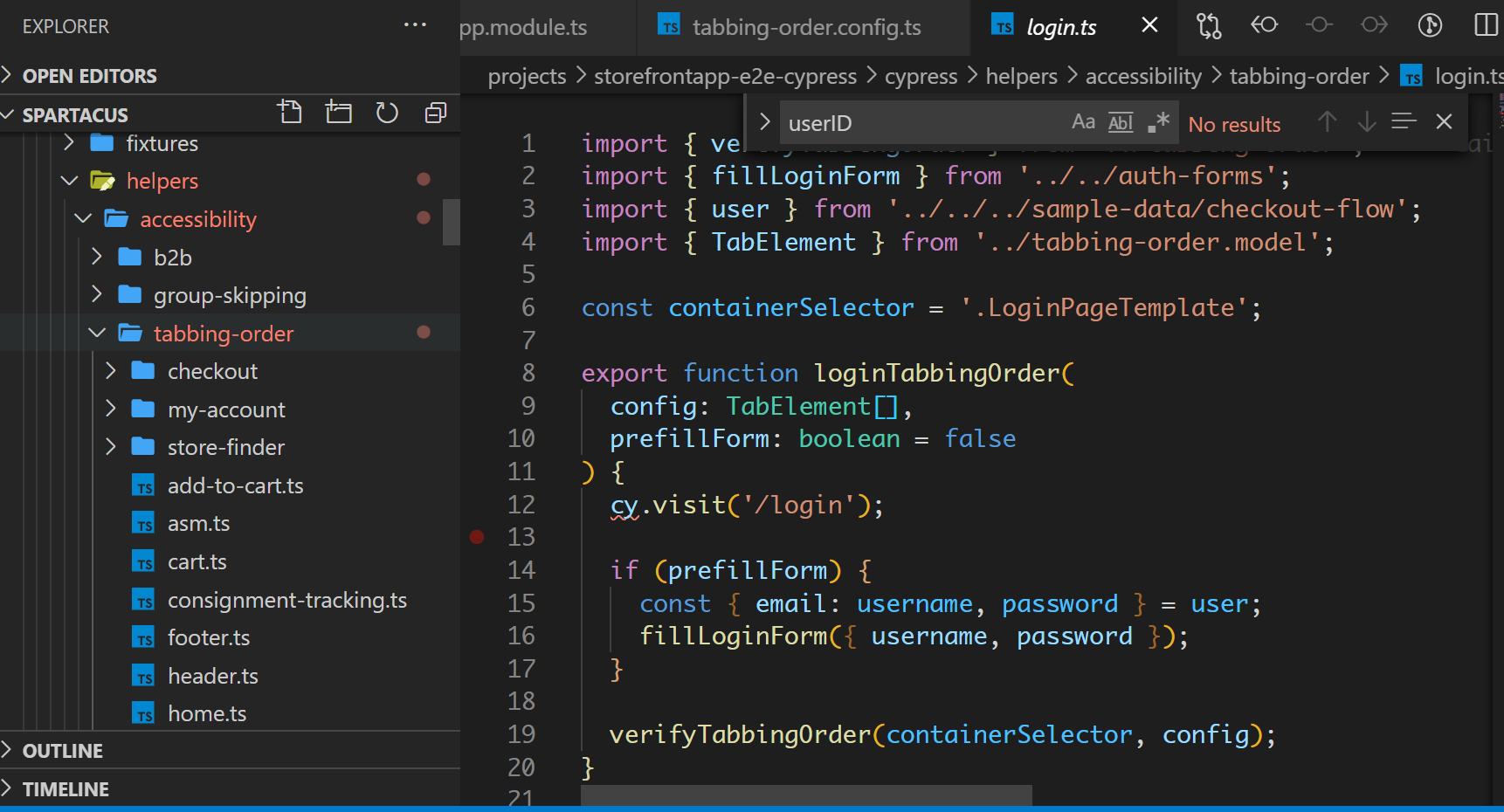 c. loginTabbingOrder 是您在 login.ts 帮助文件中创建的函数,(config.login) 是指您添加到 projects/storefrontapp-e2e-cypress/cypress/helpers/accessibility/tabbing-order 中的配置对象的登录属性 .config.ts(在此过程的第 1 步中)。