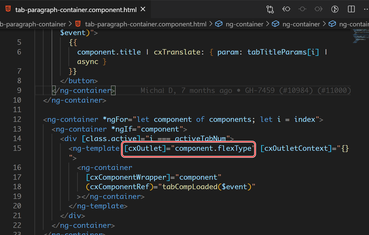 在 tab container 的实现 HTML 代码里看到了 cxOutlet 指令,其参数为 Component.flexType:
