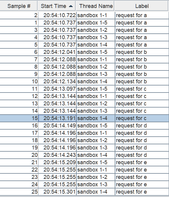 可以看到,第二个线程的第二次,第三次,第四次和第五次执行,都被延迟到了很后面的位置。