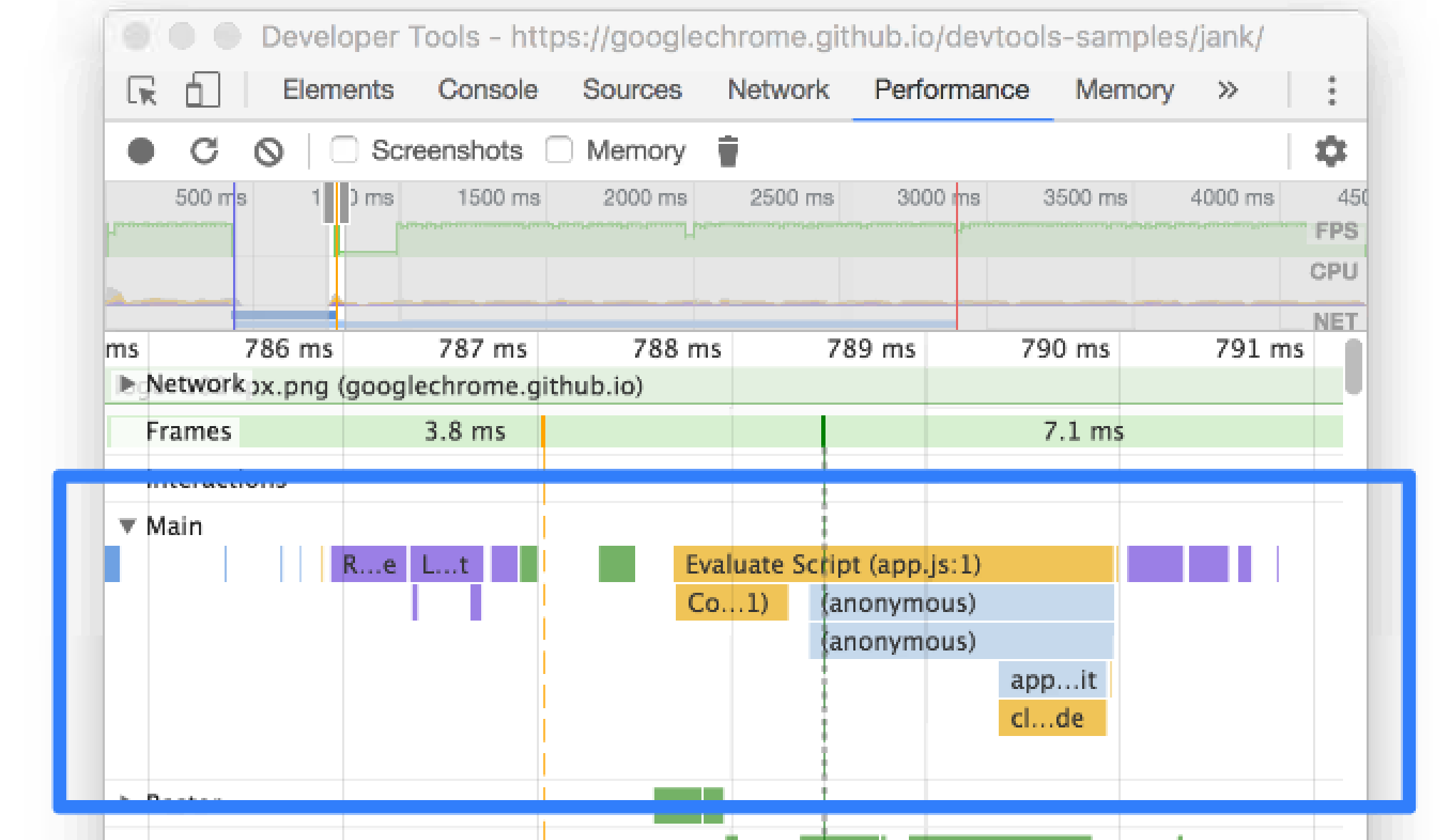 查看主线程活动以查看录制时主线程上发生的每个事件
