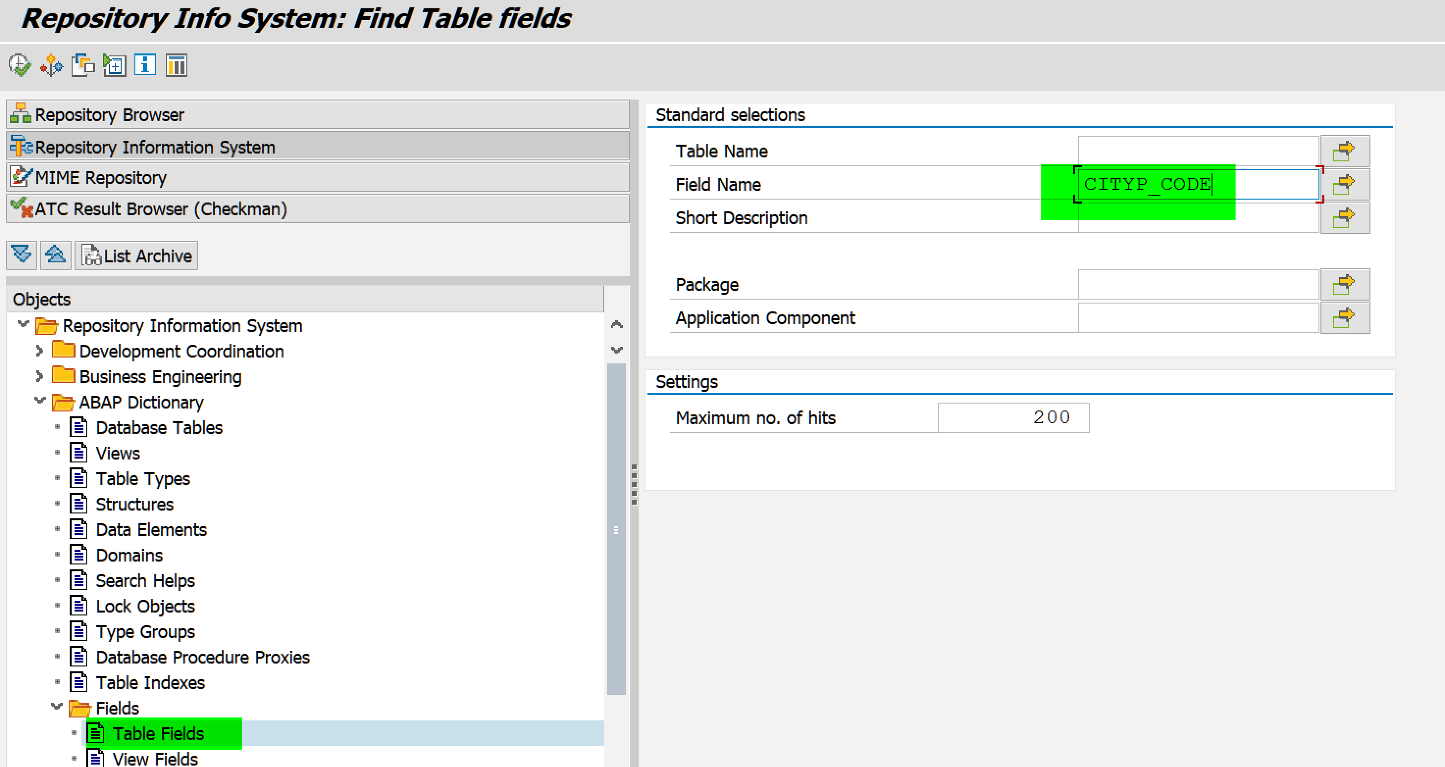 打开 SE80, 左边展开 Fields->Table Fields, 右边输入 CITYP_CODE: