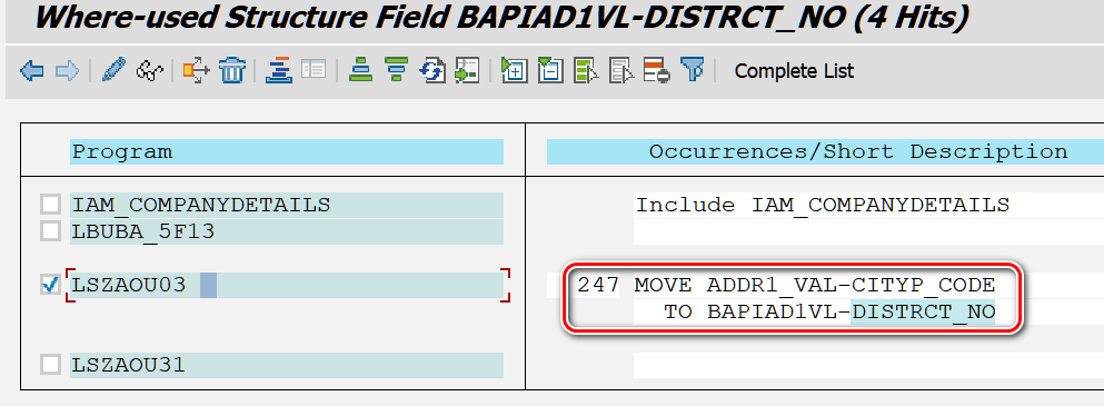 第三条记录里,发现是 ADDR1_VAL 结构的 CITYP_CODE 字段,写入了我们要查找的目标结构 BAPIAD1VL-DISTRCT_NO 字段。