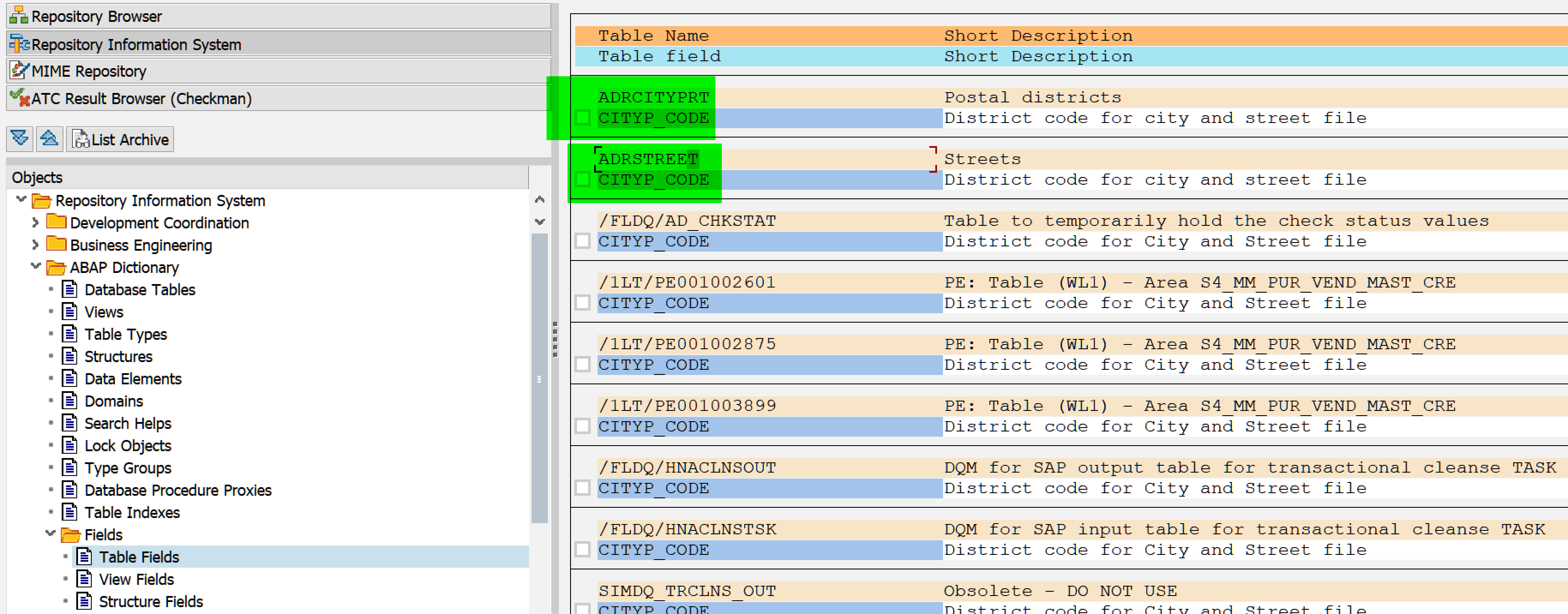 在搜索结果里,发现 ADRCITYPRT 和 ADRSTREET 这两张表的 CITYP_CODE 字段最有可能是我们要查找的字段。