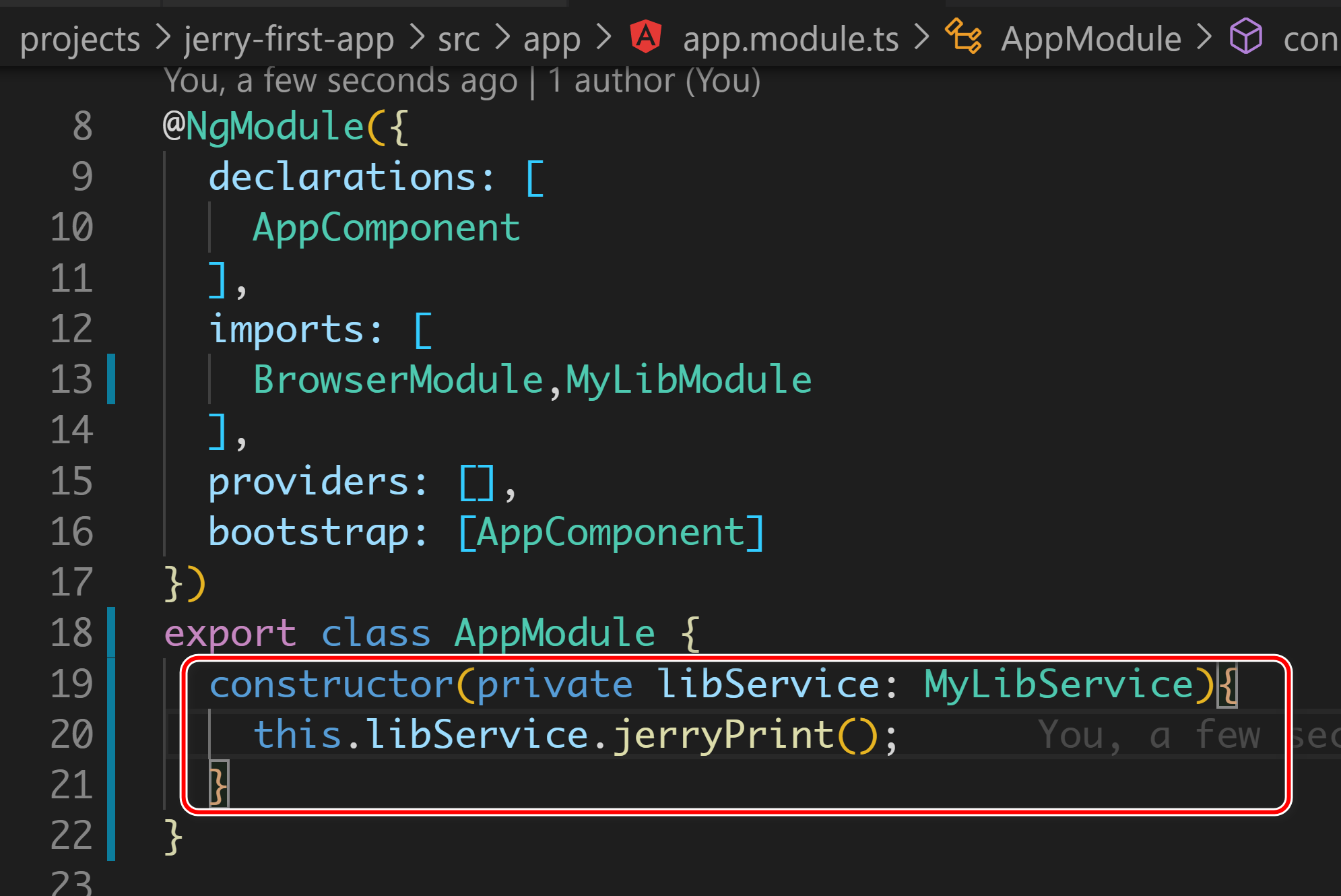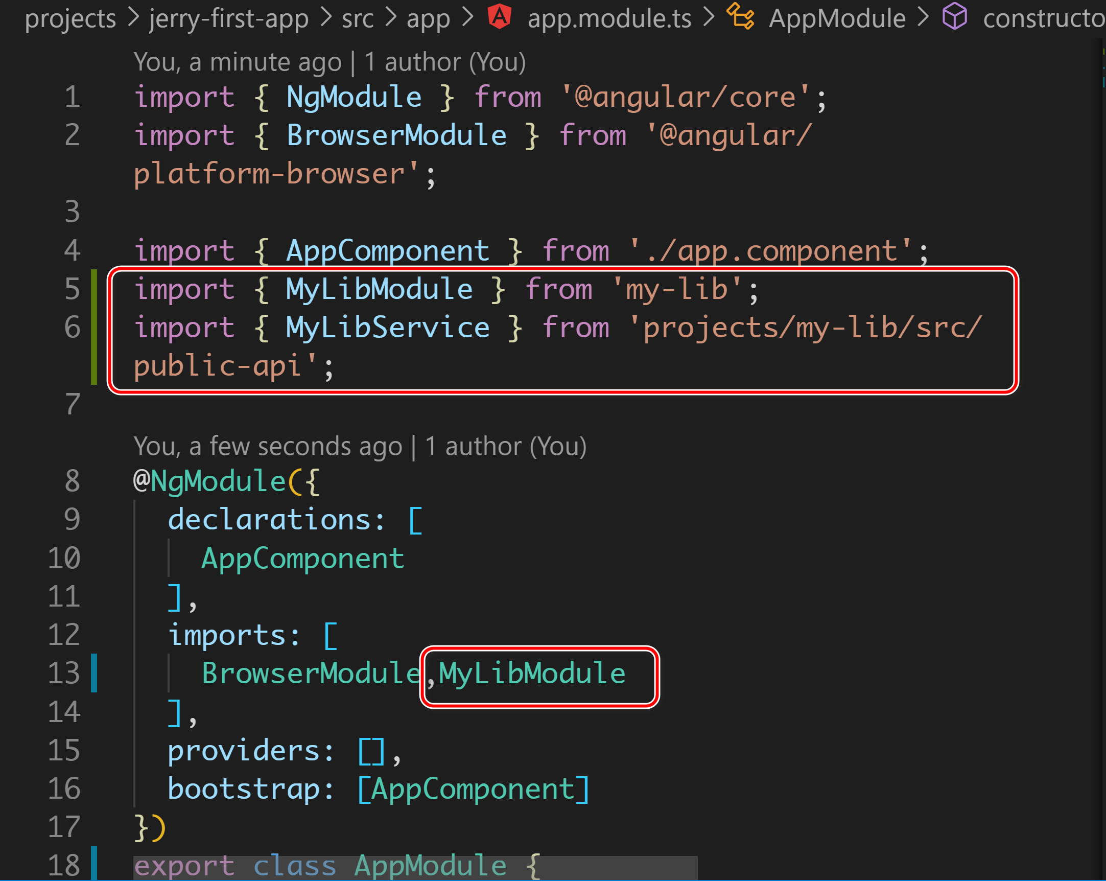直接在我们的 AppModule 的 imports 区域里,导入我们的 Angular library 通过 public_api.ts 导出的 component 和 service 即可。