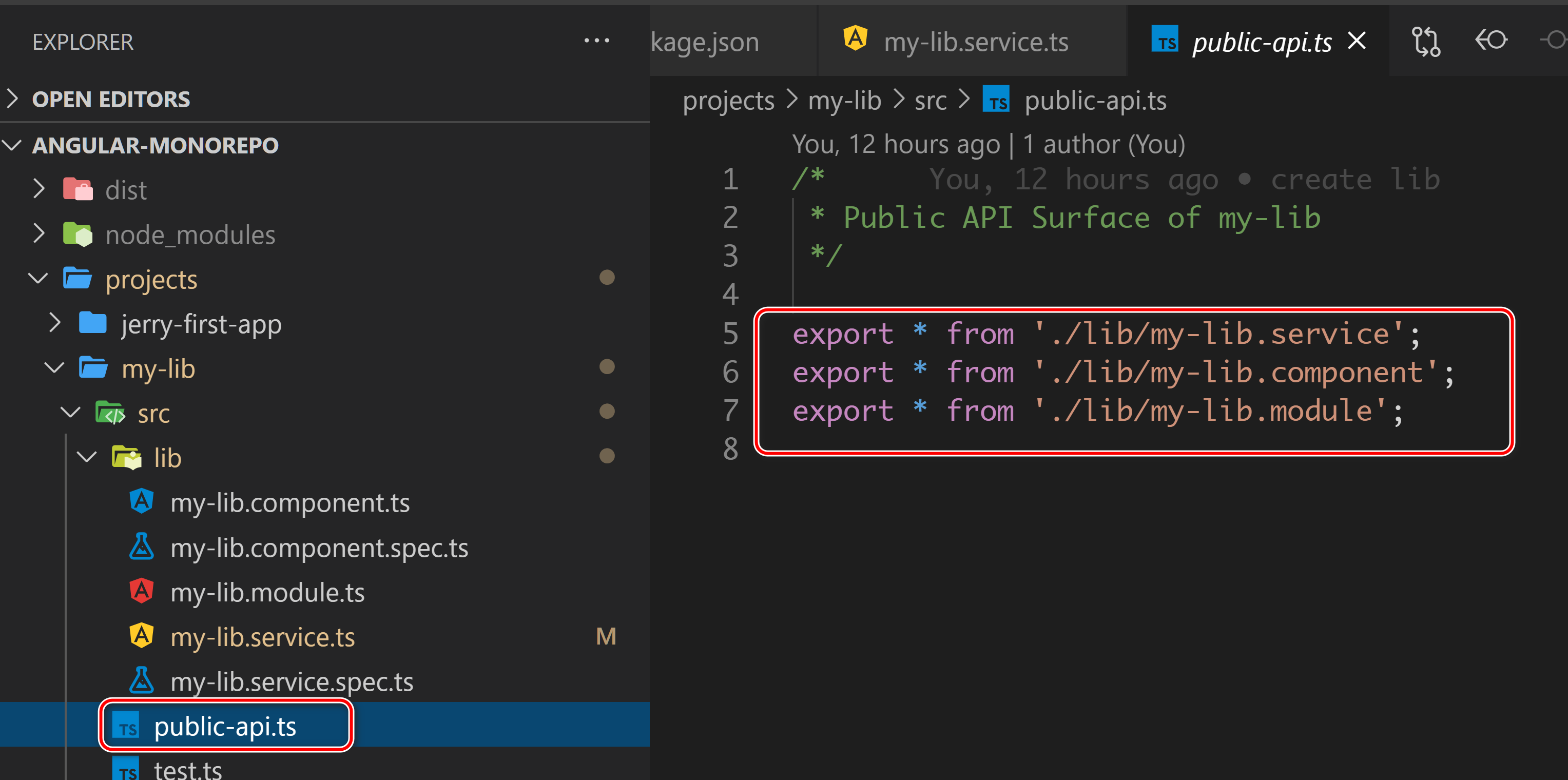 库的公共 API 是在库文件夹下的 public-api.ts 文件中维护的。当你的库被导入应用时,从该文件导出的所有内容都会公开。