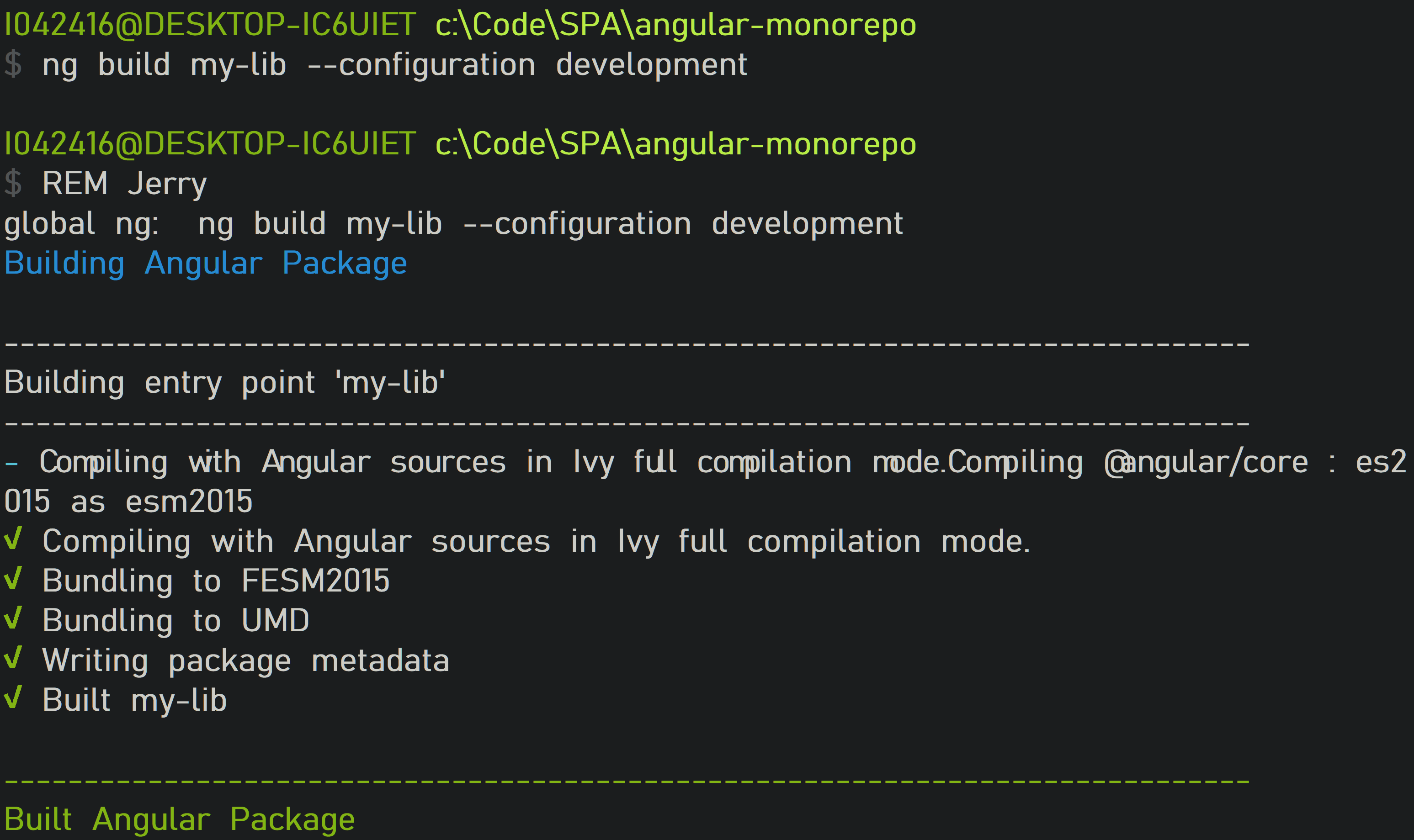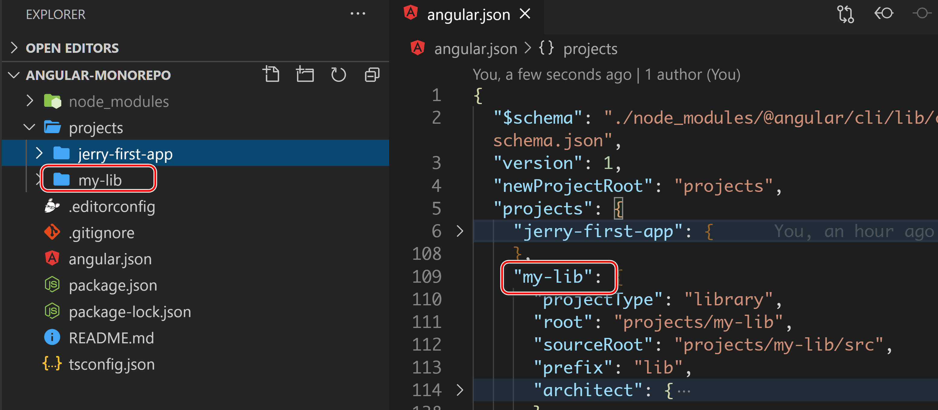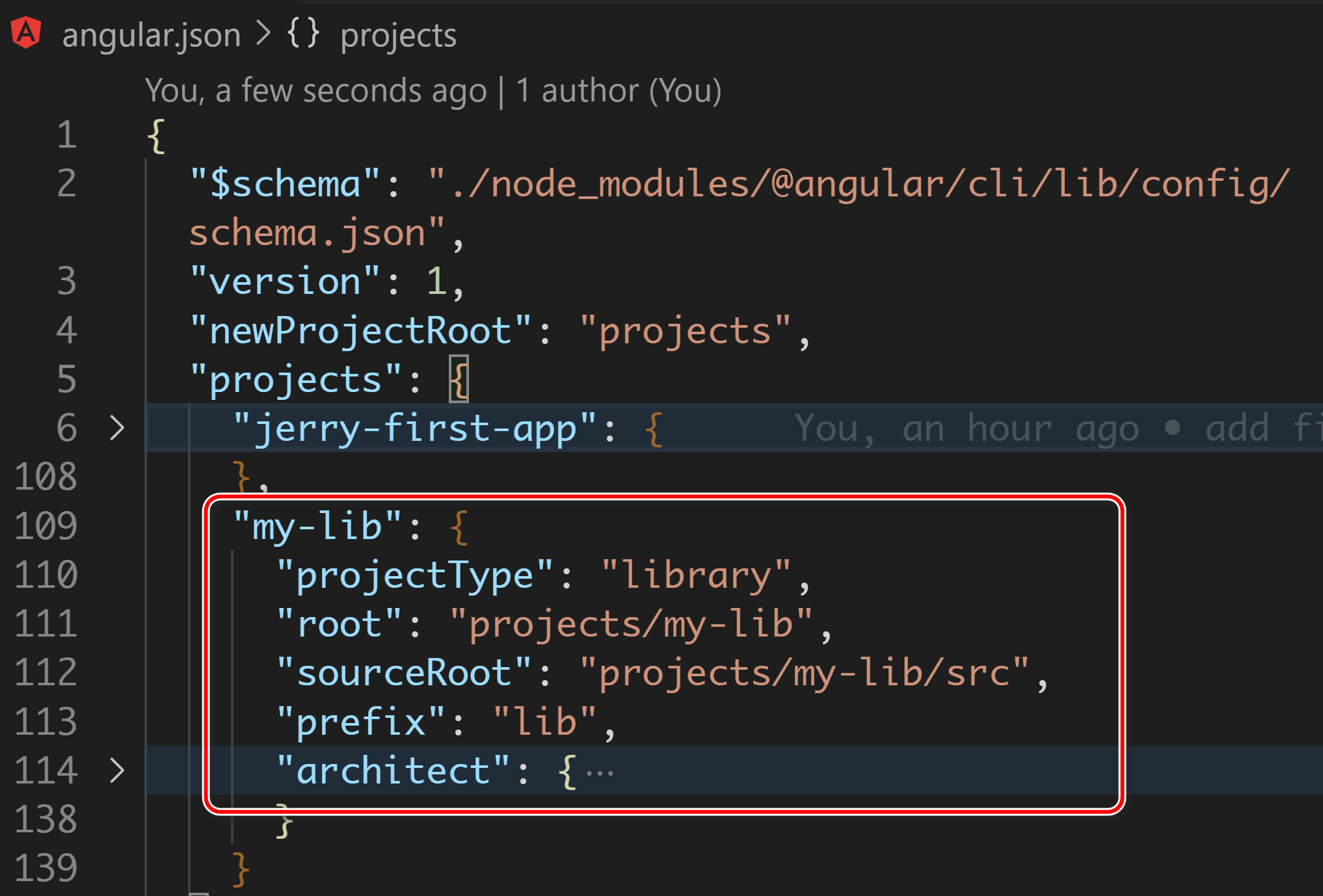 angular.json 文件在 projects 节点下,多了一个 my-lib 节点,其 projectType 类型为 library: