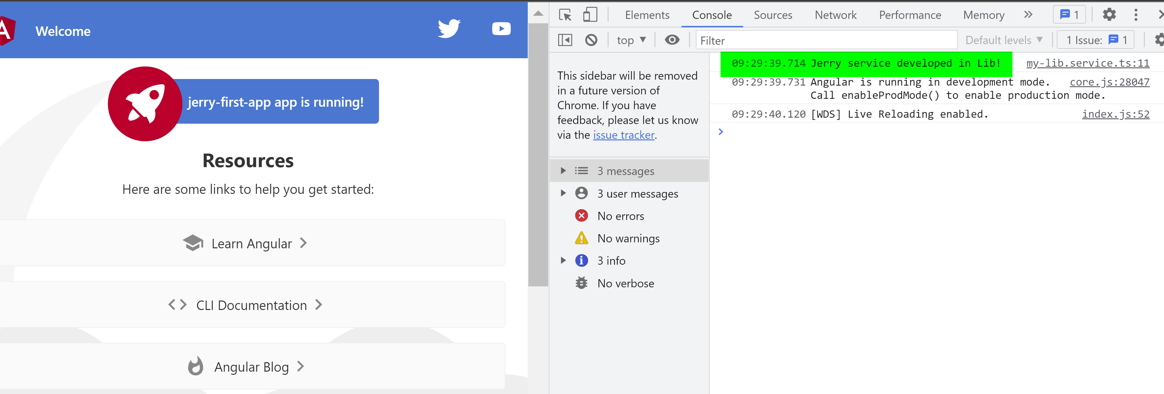 运行 Angular 应用,发现我们 Angular 库里的 service 打印出的字符串,说明 library 使用成功了: