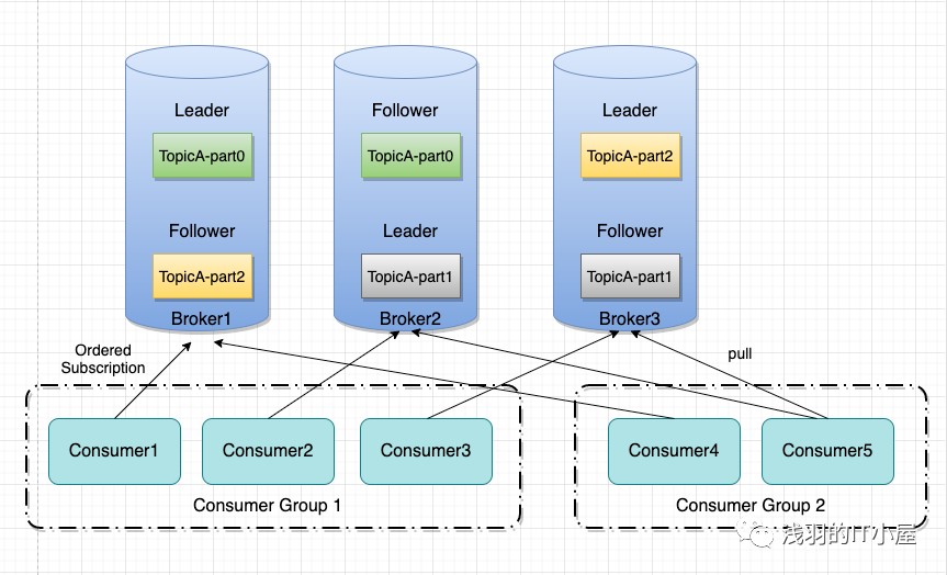 - Consumer Group:消费者分组,每个 Consumer 必须属于一个 group