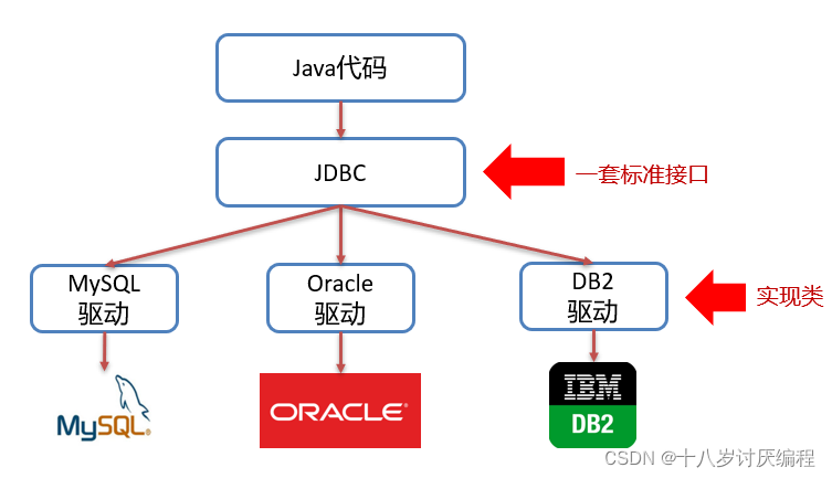 我们开发的同一套Java代码是无法操作不同的关系型数据库,因为每一个关系型数据库的底层实现细节都不一样。如果这样,问题就很大了,在公司中可以在开发阶段使用的是MySQL数据库,而上线时公司最终选用oracle数据库,我们就需要对代码进行大批量修改,这显然并不是我们想看到的。我们要做到的是同一套Java代码操作不同的关系型数据库,而此时sun公司就指定了一套标准接口(JDBC),JDBC中定义了所有操作关系型数据库的规则。众所周知接口是无法直接使用的,我们需要使用接口的实现类,而这套实现类(称之为:驱动)就由各自的数据库厂商给出。