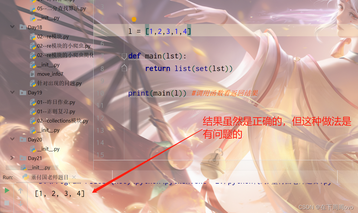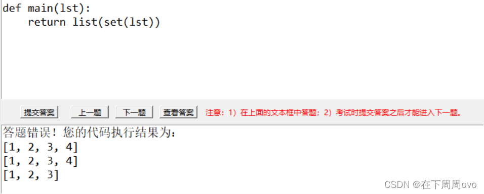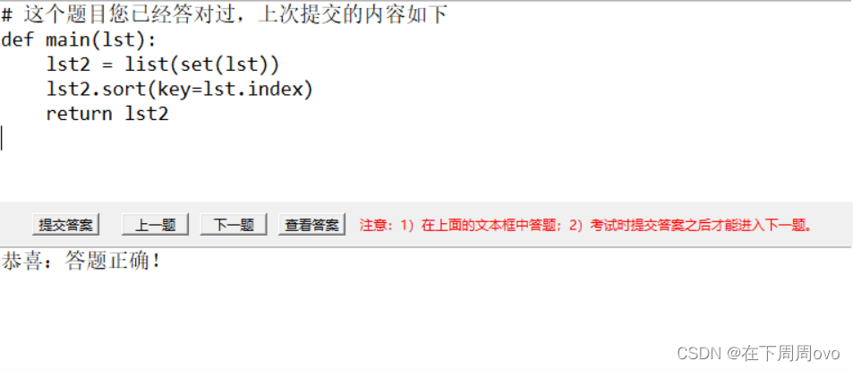 不严谨的原因是转化为set(lst)后虽然去重了,但生成集合是无序的,之后在list(set(lst))也可能是无序的,这与题意要求的顺序是不匹配的