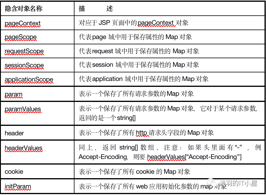 EL表达式定义了一些内置(隐式)对象,利用这些隐式对象,开发人员可以获得对web中常用对象的引用,从而获的这些对象中的数据