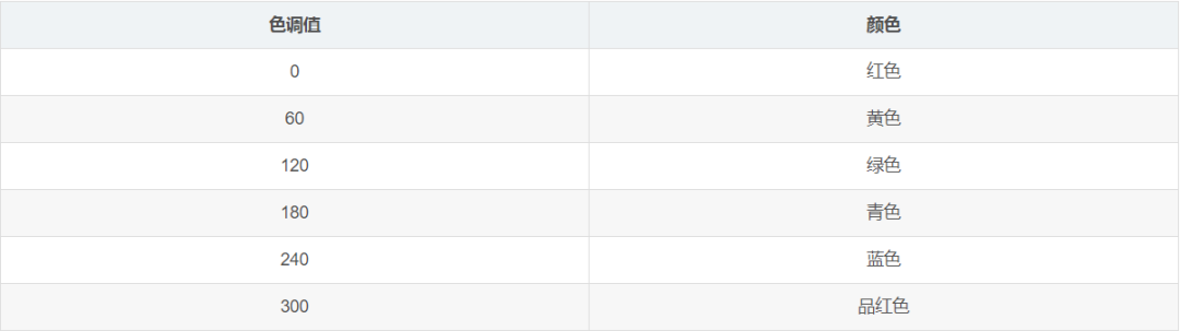 色调是色彩的基本属性,就是平常说的颜色的名称,如“赤橙黄绿青蓝紫”等。色调与混合光谱中的主要波长相关,从波长的角度考虑,不同波长的光变现为不同的颜色,实际上体现的是色调的差异。色调的取值区间为[0,360]。色调取不同值,所代表的颜色如下表: