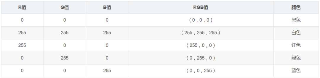 在RGB色彩空间中,存在R(red)、G(green)、B(blue)三个通道。每个色彩通道值的范围都在[0,255]之间,我们用这三个色彩通道的组合表示颜色。下图表示不同RGB对应的颜色: