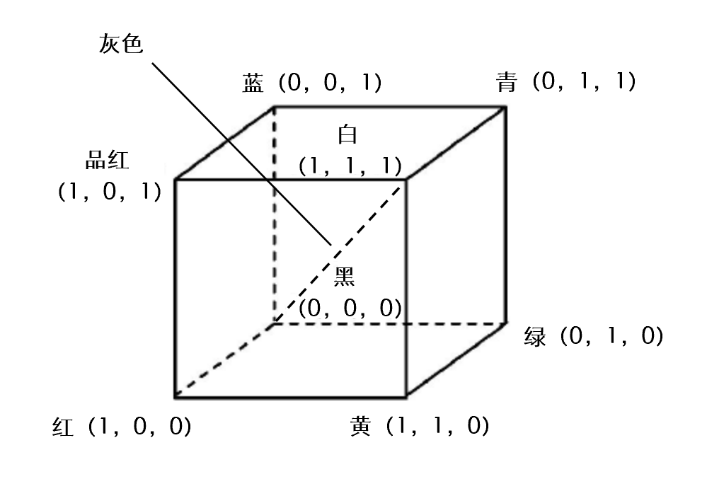 将R、G、B三个通道作为笛卡尔坐标系中的X、Y、Z轴,就得到了一种对于颜色的空间描述,如图:
