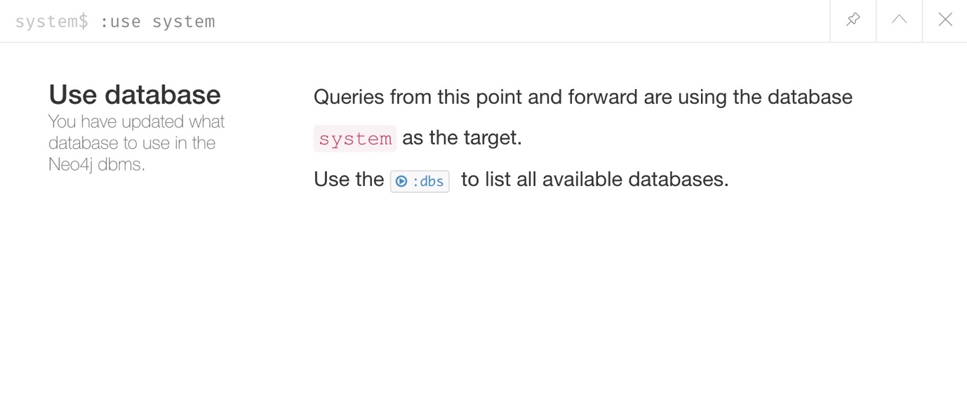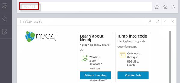 如前所述,当安装Neo4j并创建一个实例时,它将由两个数据库启动:一个系统数据库和一个默认(neo4j)数据库。 启动Neo4j浏览器将自动将我们指向neo4j默认数据库,如命令行中neo4j$ 提示符所示。