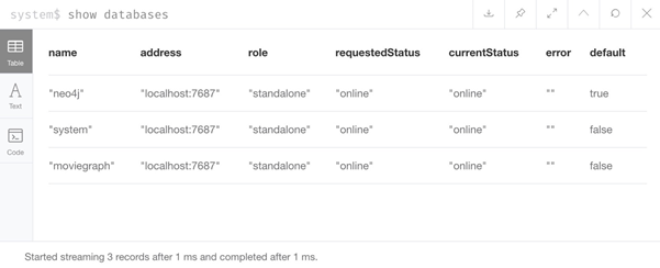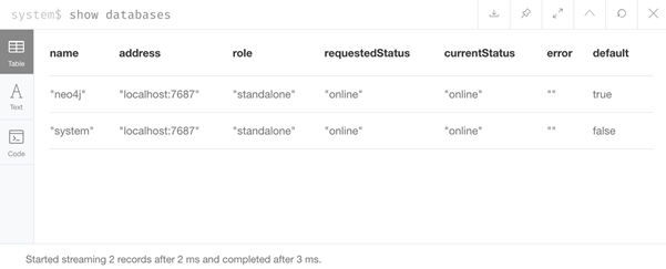 现在,我们可以运行命令来查看使用实例创建的数据库。 SHOW DATABASES命令将显示我们实例中的所有数据库(或群集中跨实例的数据库)以及地址、角色、请求和当前状态,任何错误以及默认的数据库。请记住,此时,我们只希望使用系统数据库和默认(neo4j)数据库。