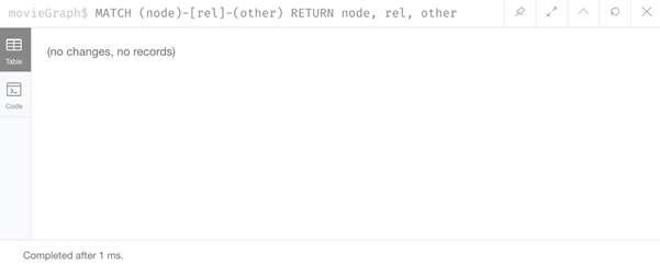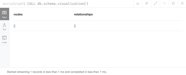 接下来,我们将一些样本数据加载到movieGraph数据库中并使用它。 在执行此操作之前,让我们通过使用CALL db.schema.visualization()过程查看模式来验证数据库是否真正为空。