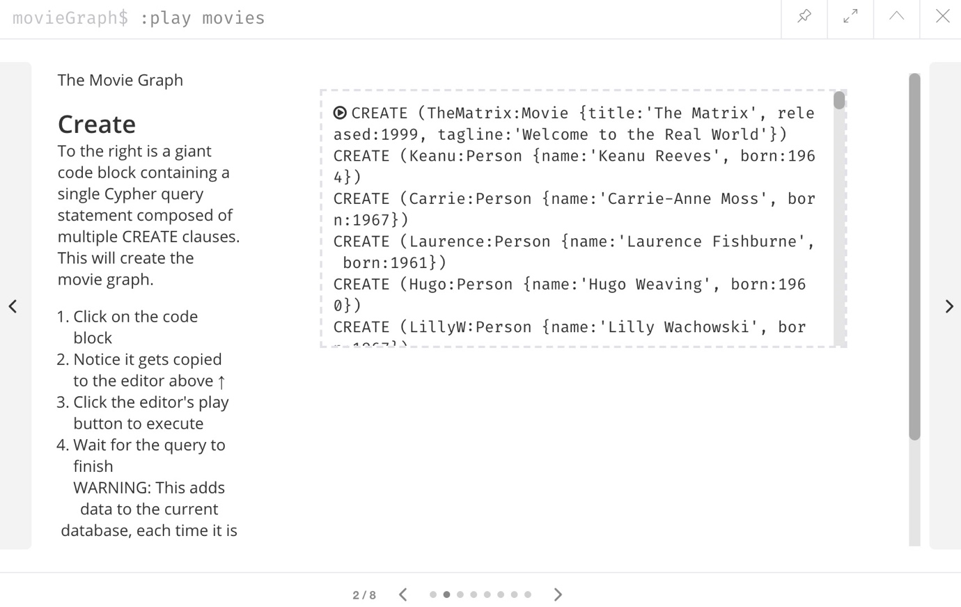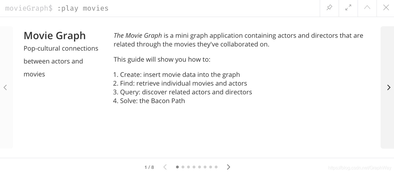 我们将使用Neo4j用户可能已经熟悉的电影小数据集。 要加载,请在命令行中输入:play movies命令并执行。 指南将显示在结果窗格中。