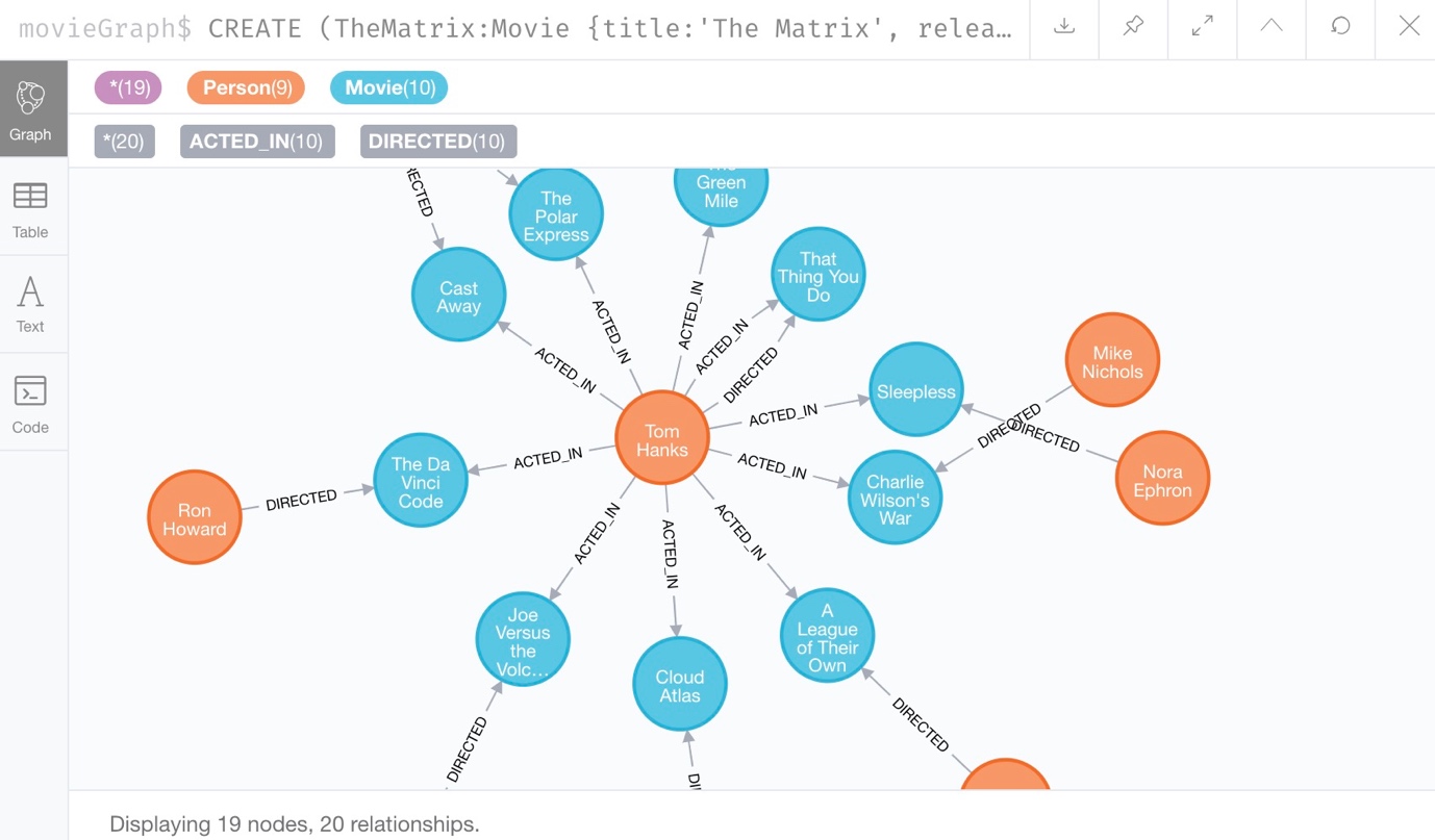 现在,我们可以对想要的电影数据运行任何查询。 例如,使用如下所示的通用查询将可以搜索与其他节点有任何关系的节点。