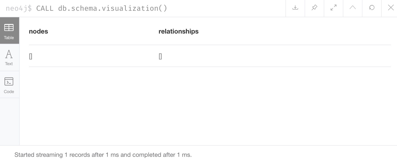 为了确认当前该数据库中没有数据,我们可以对neo4j运行CALL db.schema.visualization()过程。