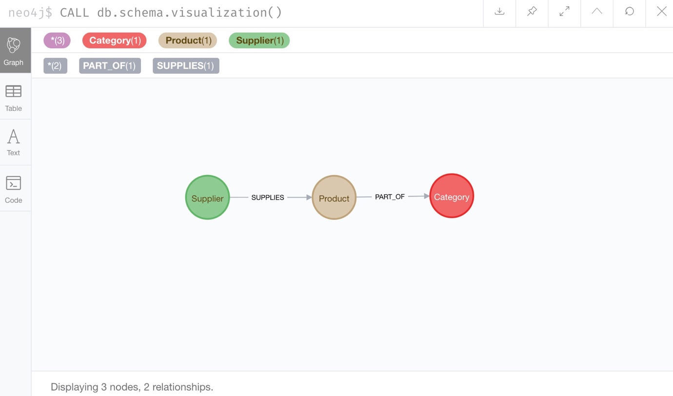 单击并运行这两个语句,然后我们可以通过再次运行模式过程来检查数据是否正确加载。 我们应该期望与产品节点有关系的供应商节点与类别节点有关系的供应商节点。
