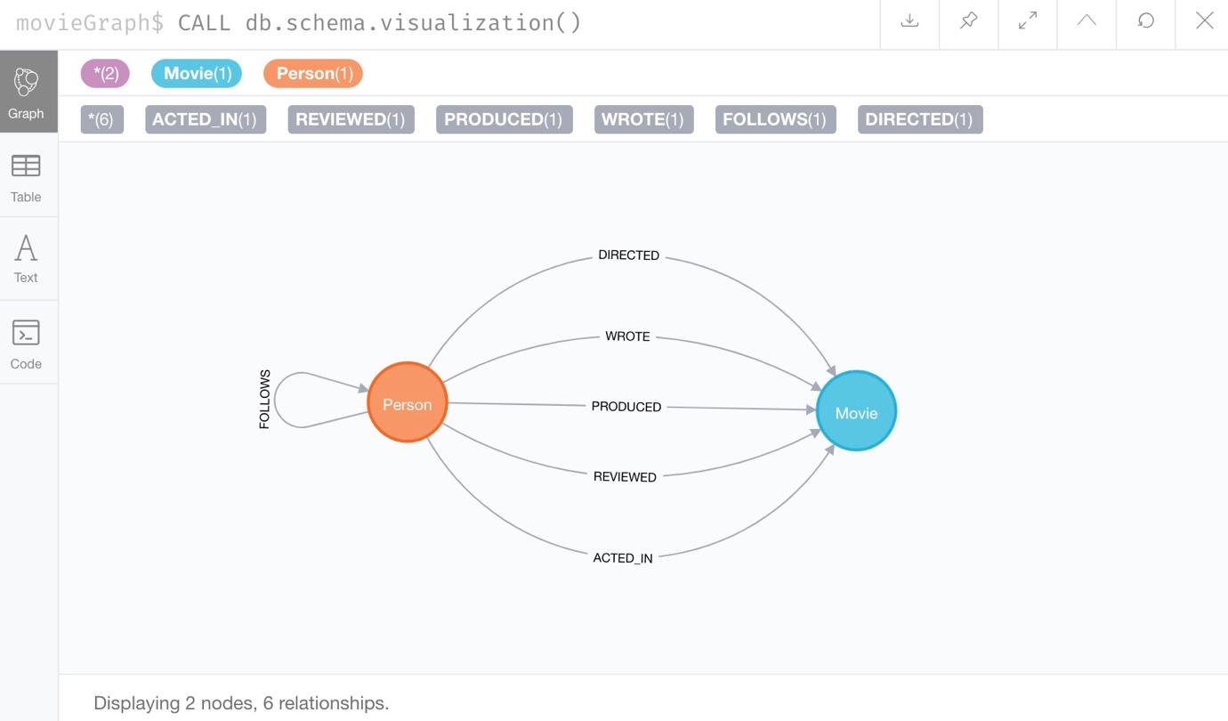 我们还可以再次检查架构过程,以查看数据在数据库(数据模型)中的组织方式。 再次使用命令CALL db.schema.visualization()并执行它,以查看我们具有通过几种不同类型的关系连接的Person节点和Movie节点。