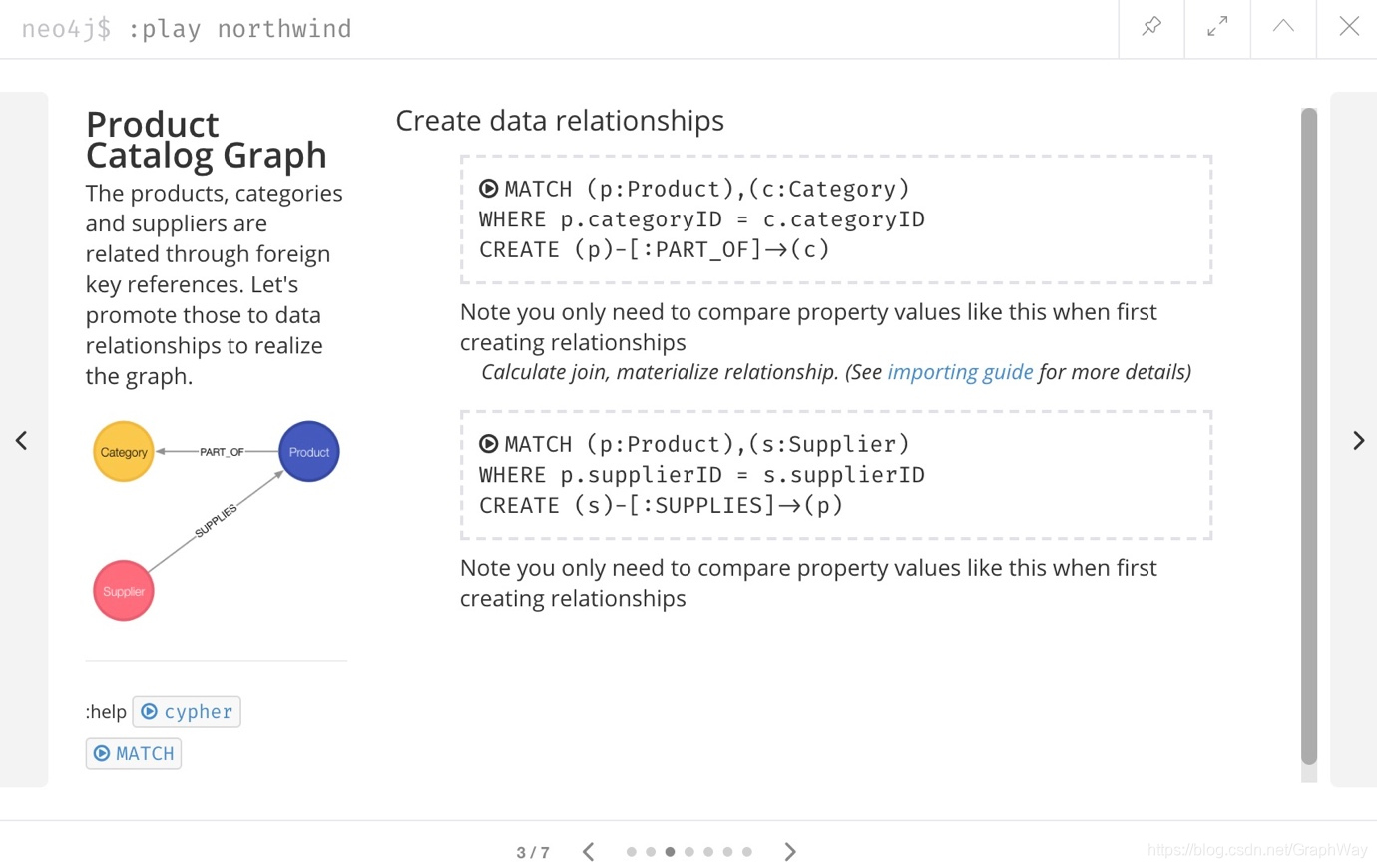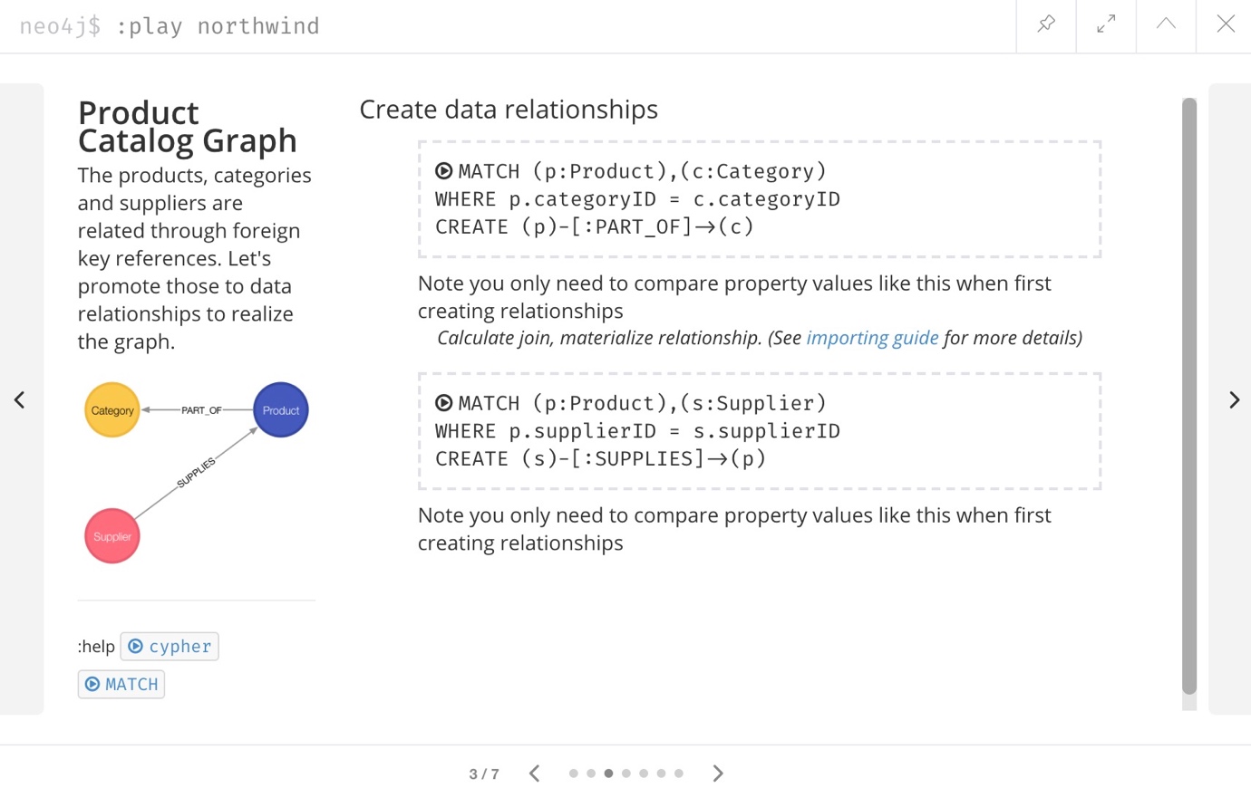 执行所有6个步骤以填充节点,然后再次单击指南上的向右箭头以前进至下一张幻灯片。 在此幻灯片上,我们还有2条语句来查找节点并在它们之间创建关系。