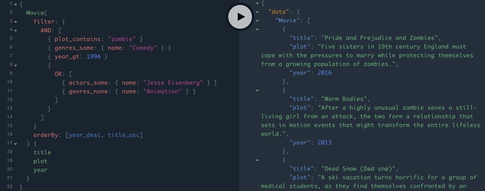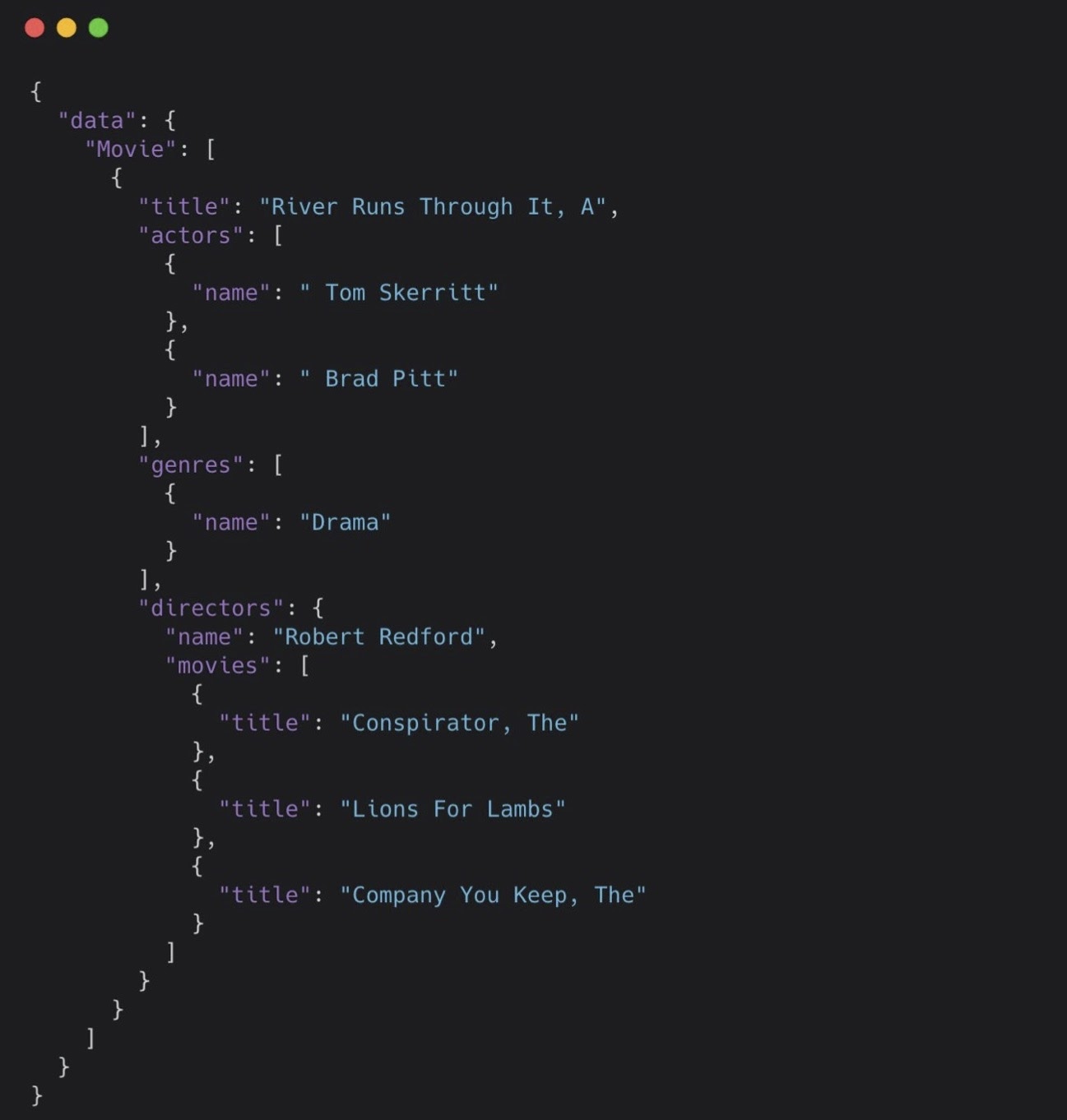 如果用GraphQL来查询这个电影数据库,搜索名称是“A River Runs Through It.”的影片,我们只要把下面的参数传递给API就可以了: