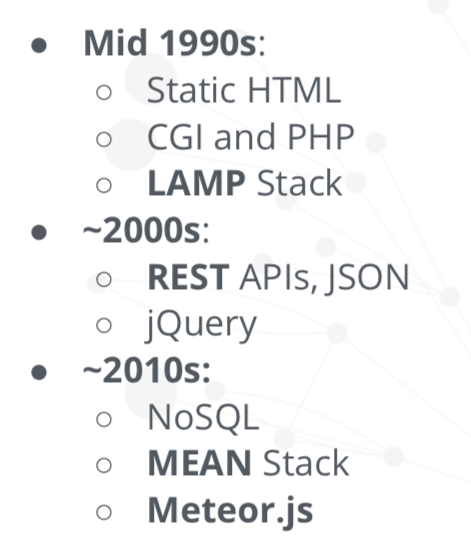 在那之后,我们看到能支持Web规模的数据库的需求,因此有了NoSQL和MEAN堆栈的出现,也就是Mango、Express、Angular和Node.js。它们使得将文档数据库中的文档映射到REST API变得很容易。我们还开始看到像Angular这样的前端框架,它使我们更容易封装逻辑和UI。而Meteor则使得实现近乎实时的流内容得Web应用开发成为可能。