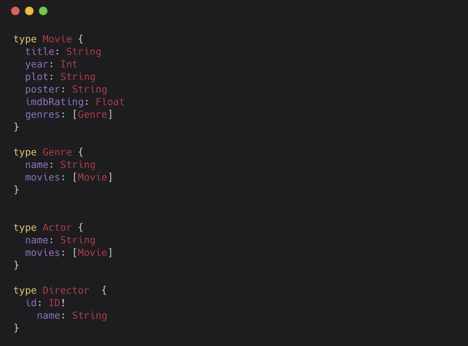 GraphQL首先是一种模式定义语言。例如,如果我们要定义一个关于电影-导演-演员的数据模型,可以用GraphQL这样描述: