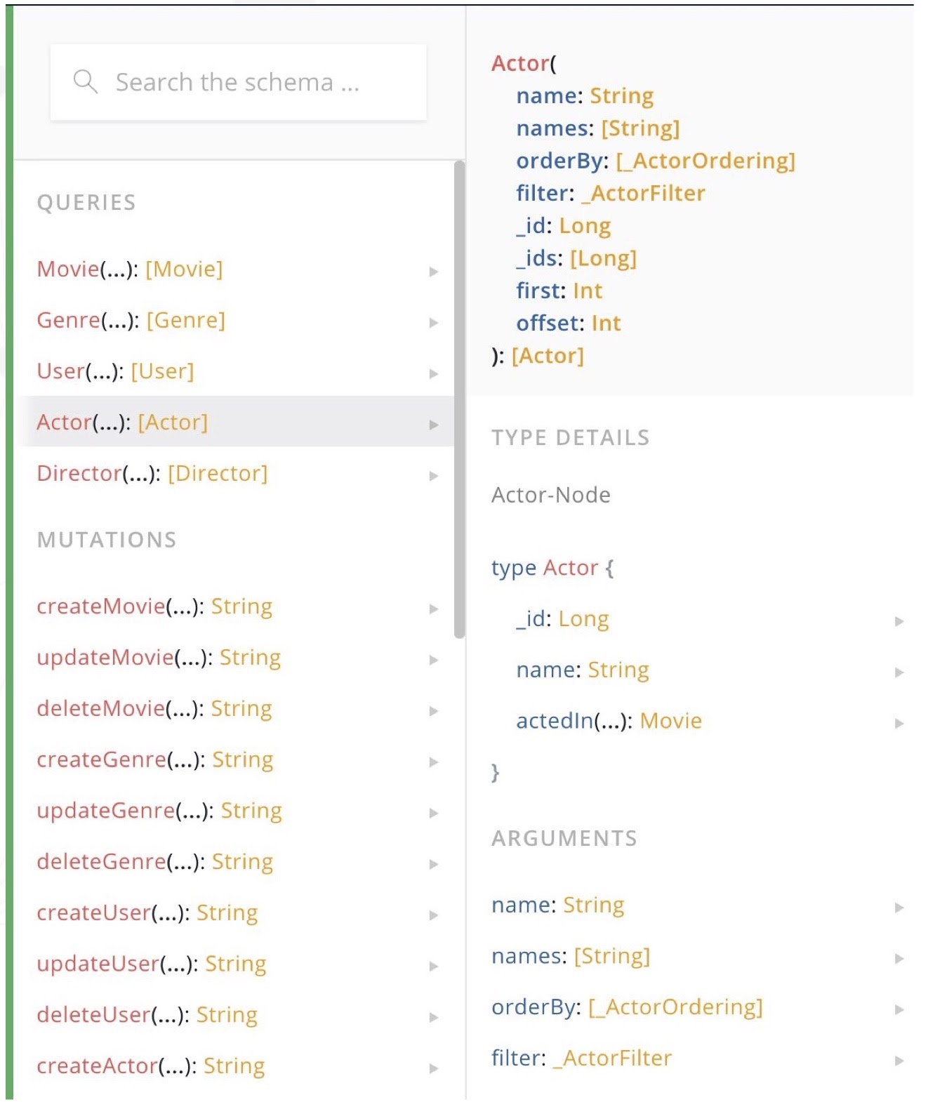 当我们把上面的模式定义发布到GraphQL服务端(例如Apollo)后,GraphQL的“自省”(Introspect)功能会自动生成并发布一系列标准查询和数据库操作功能。如果用GraphiQL和GraphQL Playground之类的工具,可以看到类似下面的服务接口: