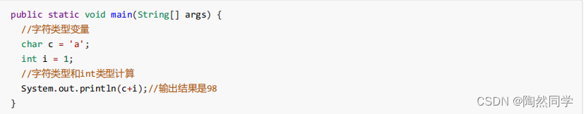 在 char 类型和 int 类型计算的过程中, char 类型的字符先查询编码表,得到 97 ,再和 1 求和,结果为