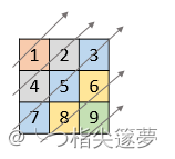 - 给你一个列表 nums,里面每一个元素都是一个整数列表。请你依照下面各图的规则,按顺序返回 nums 中对角线上的整数。
