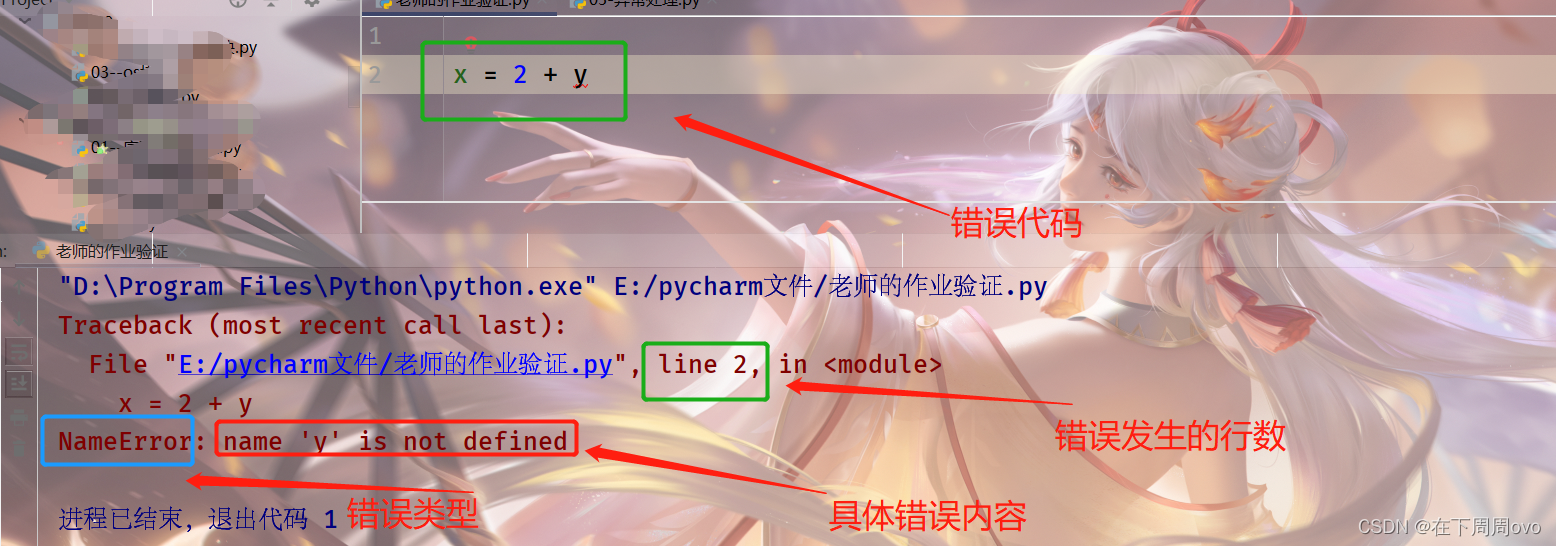 程序遇到逻辑或者算法问题运行过程中计算机错误(内存不够或IO错误)这两个或抛出异常,如果没有手动对其进行处理,那么此异常就会被解释器捕获,处理的方法为忽略或者终止程序