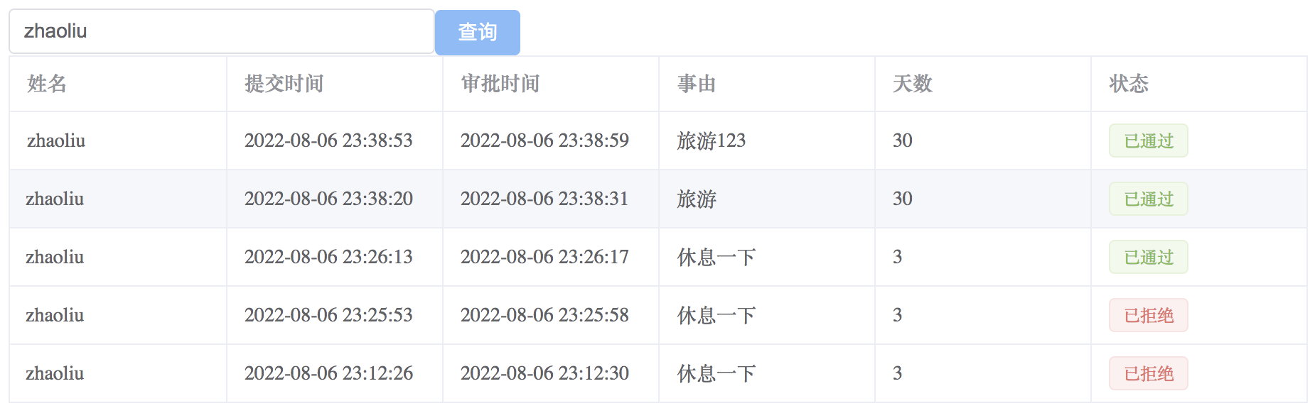 对于员工来说,也可以在一个页面查询自己请假流程的最终情况: