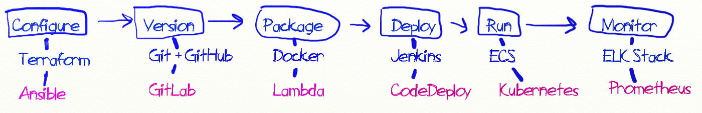 注意:上面的管道中明显缺少的是test。这是有意的–编写单元、集成和验收测试并不容易,传统上落在开发人员的肩上。“测试”阶段的省略是有意的,因为这个路线图的目标是快速吸收新的技能和工具。缺乏测试专业知识被作者认为是一个适当的DevOps就业的无关紧要的障碍。