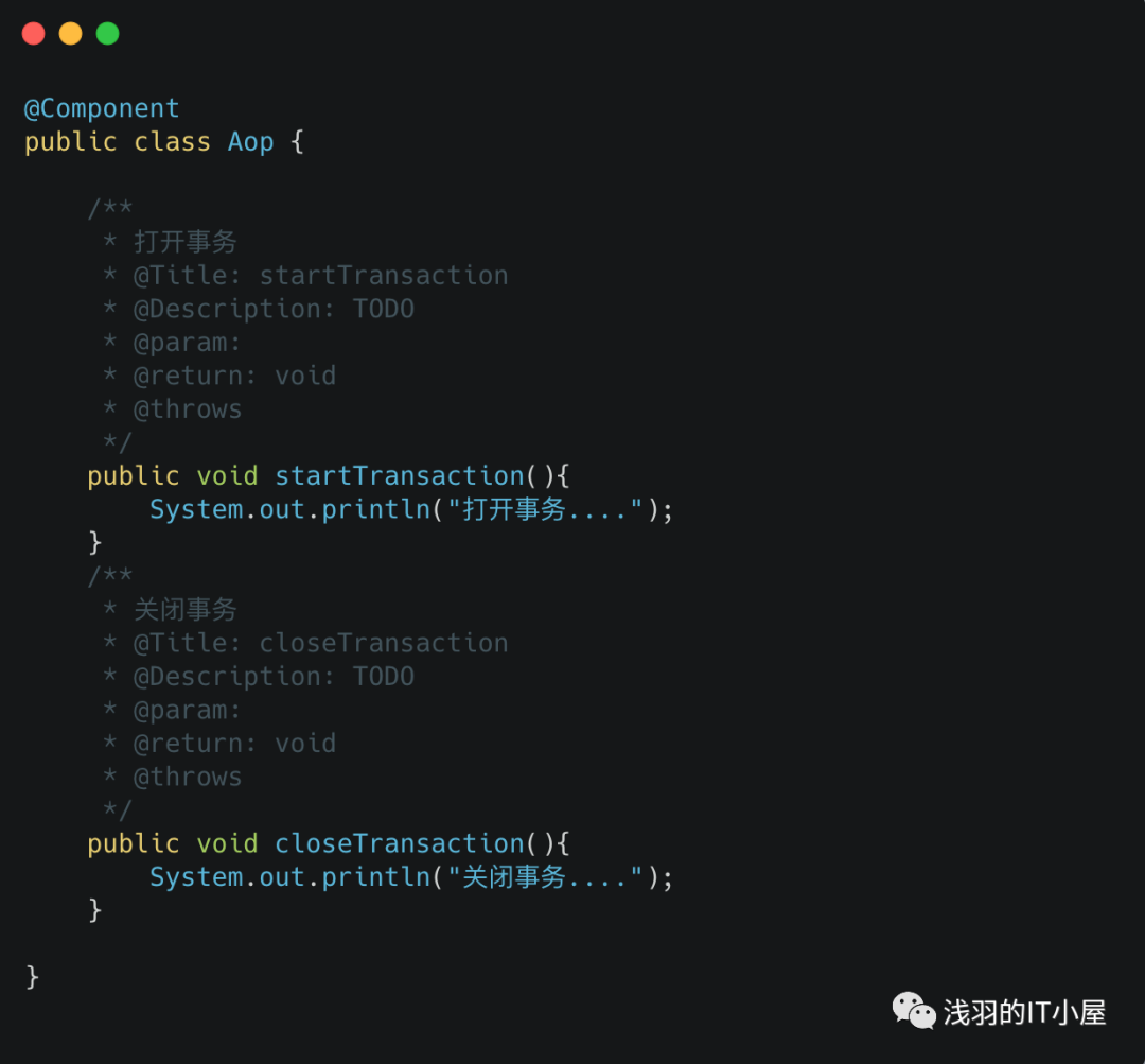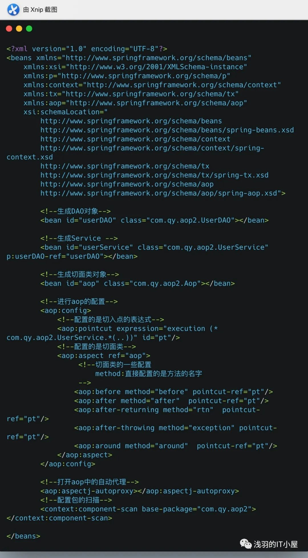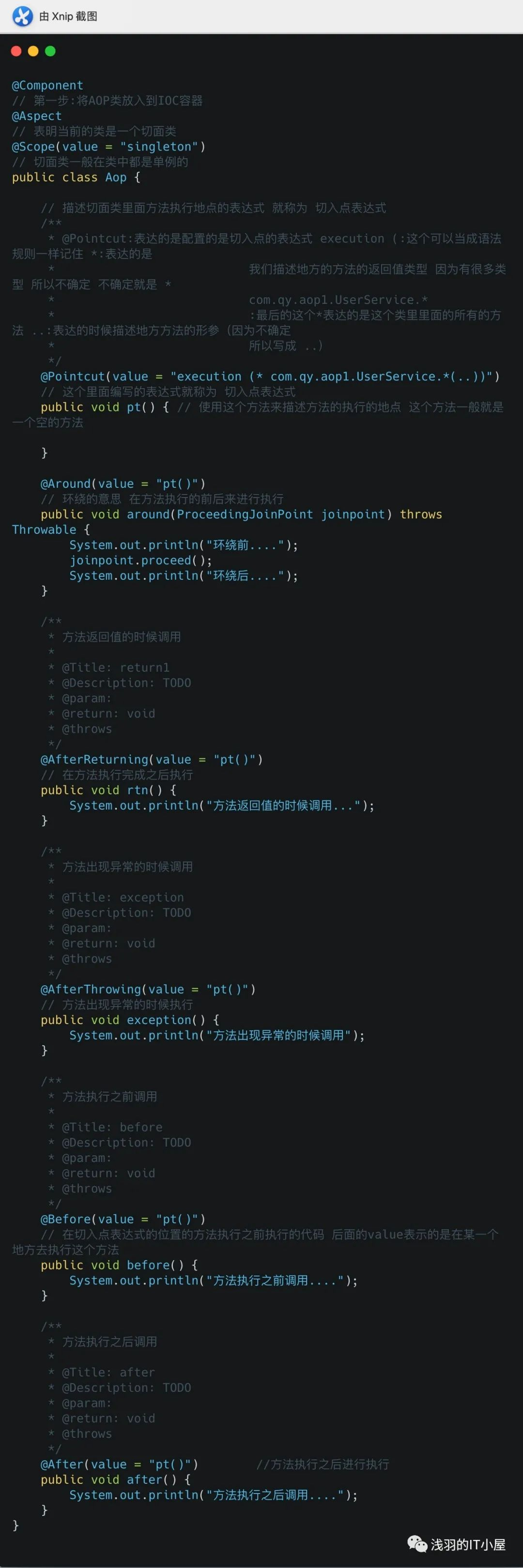 什么叫面向切面的编程?就是将软件开发的过程中 遇到的重复代码抽取出来形成一个专门的类 这个类就叫做切面类,在软件的正常的运行过程中 需要使用我们抽取出来的重复代码的时候 通过代理的设计模式 动态的植入我们的重复代码的这种编程的思想 就叫做面向切面编程