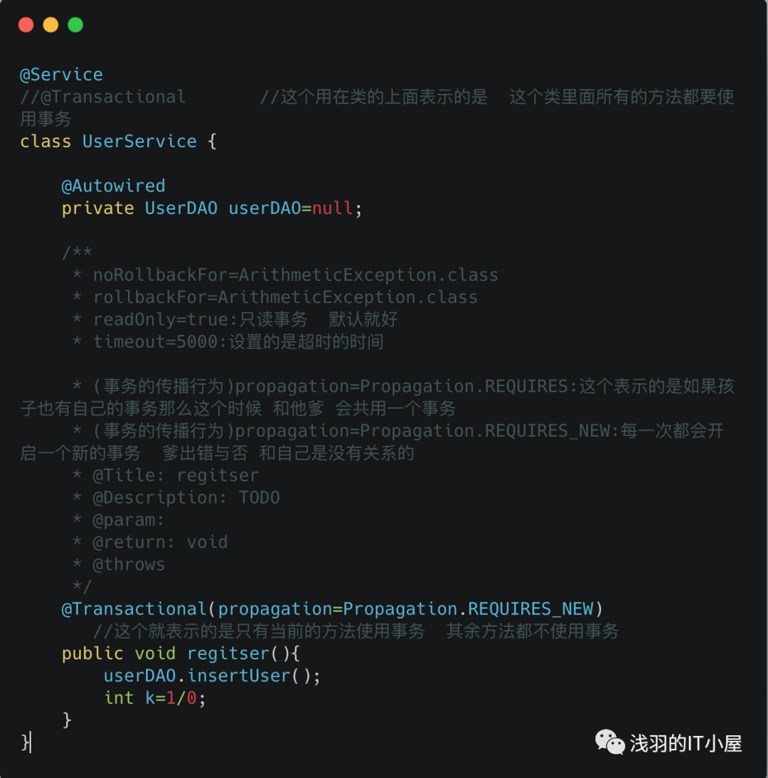 15.1:生产环境中事务是不能加在DAO层的、所有的事务处理都是加在Service层的、因为一个业务是否成功 才表示了当前的操作是否是成功的