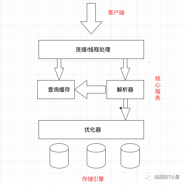 MySQL工作架构大致可以分为三层,最上面为客户端,比如:连接处理、授权认证、安全等功能都在这一层处理。