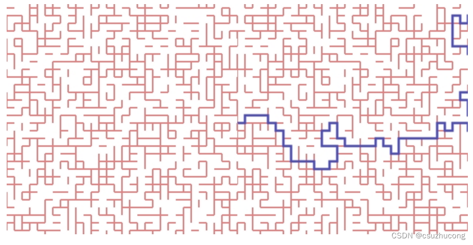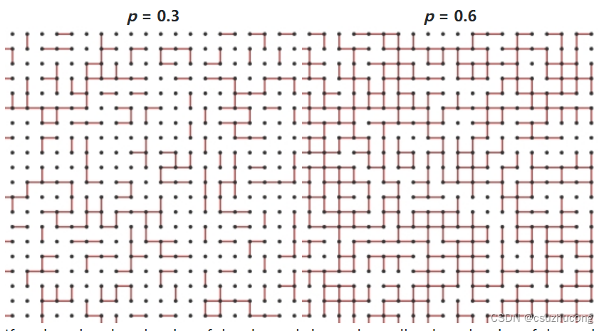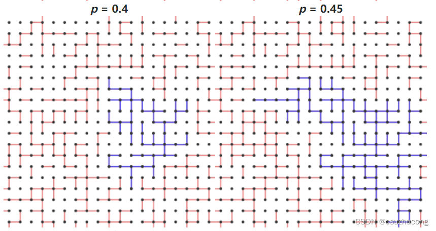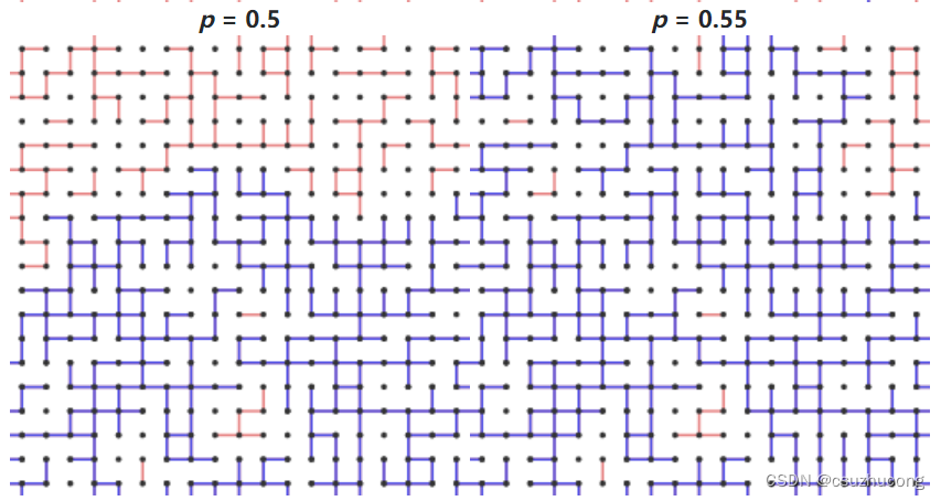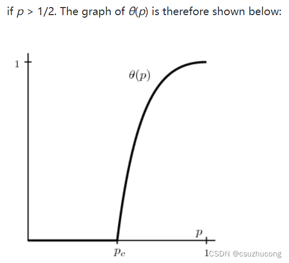 结论就是上面的分段函数θ(p) ,p大于1/2时有概率θ(p) 存在无限长路径,p小于1/2时存在无限长路径的概率为0
