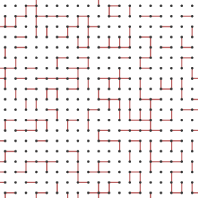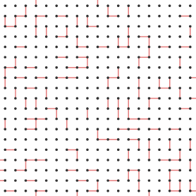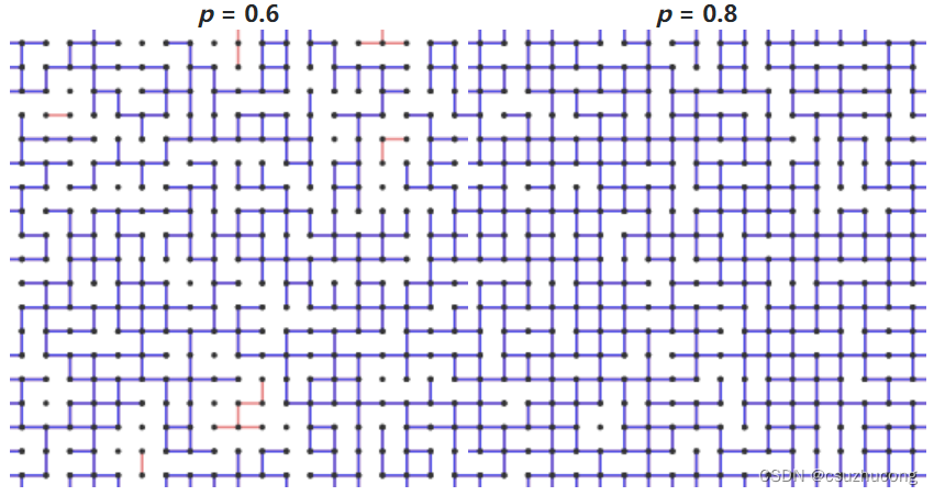 This is known as the square lattice, and we will denote it by Z2. We choose a parameter p between 0 and 1 and declare that each edge is open with probability p. Think of an open edge as a channel that is large enough to conduct water through it. Here are examples for two different values of p.