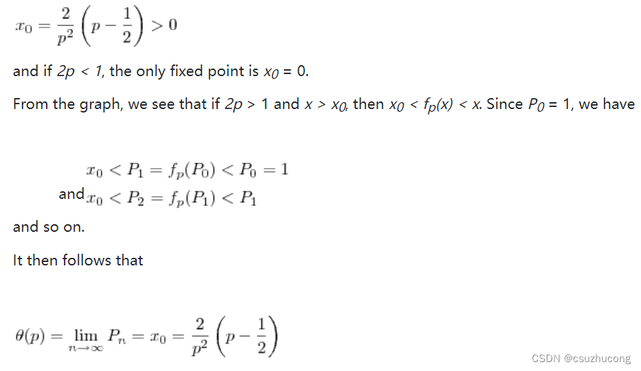 所以P = (2p-1)/p,p大于1/2时有概率P无限繁殖下去,p小于1/2时无限繁殖下去的概率为0