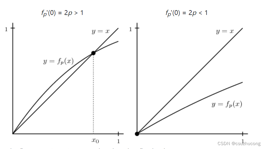 If we define the function fp(x) = 1 - (1 - px)2, we have Pn = fp(Pn-1). The graph of fp is shown below in two different cases, depending on the derivative fp'(0) = 2p.