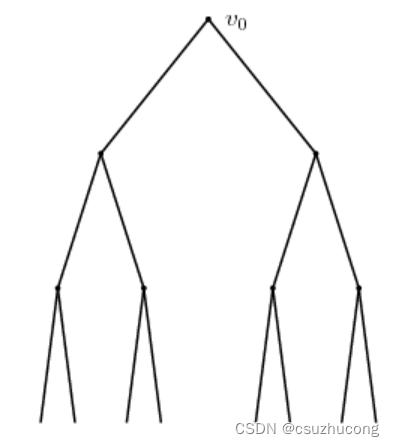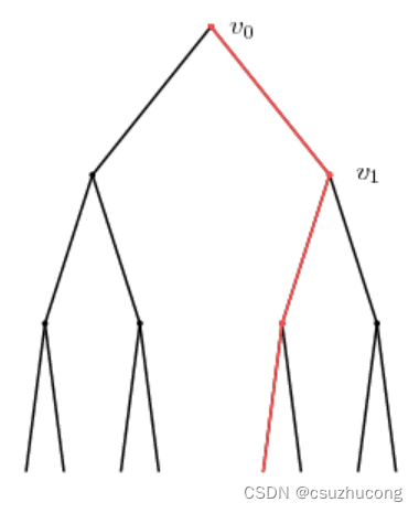 If p is the probability that each edge is open, we want to find θ(p), the probability that there is an infinite open path containing the root of the tree v0. We begin by letting Pn be the probability that there is an open path from v0 to a vertex n levels below. Notice that we have P0 = 1. Shown in red below is a path from v0 to a vertex three levels below.