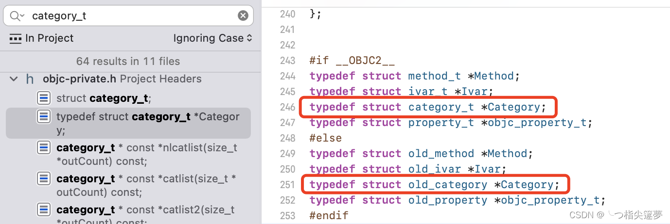 - 我们都知道:不管是对象还是类,存储在内存空间都是结构体的形式,id -> objc-object,Class -> objc_class,同样 Category 对应的结构体如下: