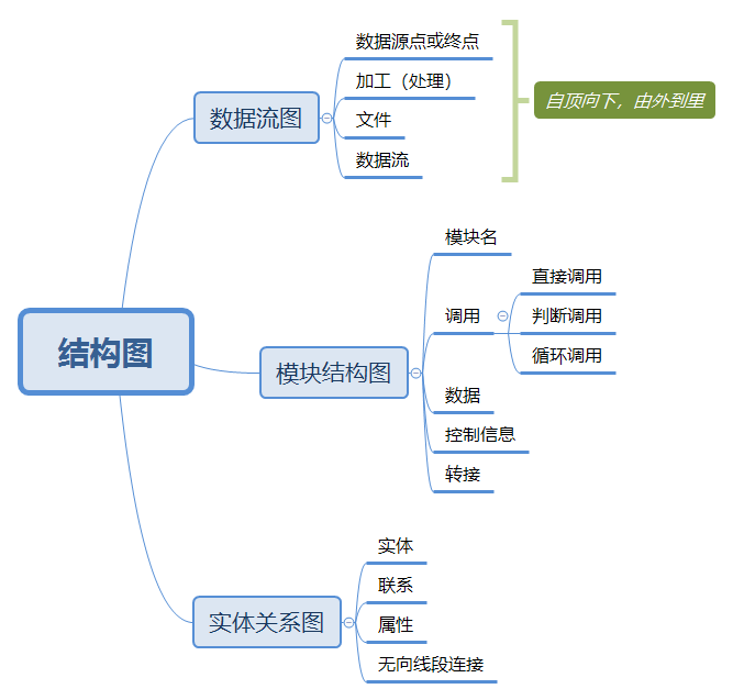 在实际运用过程中,最常见的是运用到结构图来表示结果。其中有实体关系图、数据流图和模块结构图。