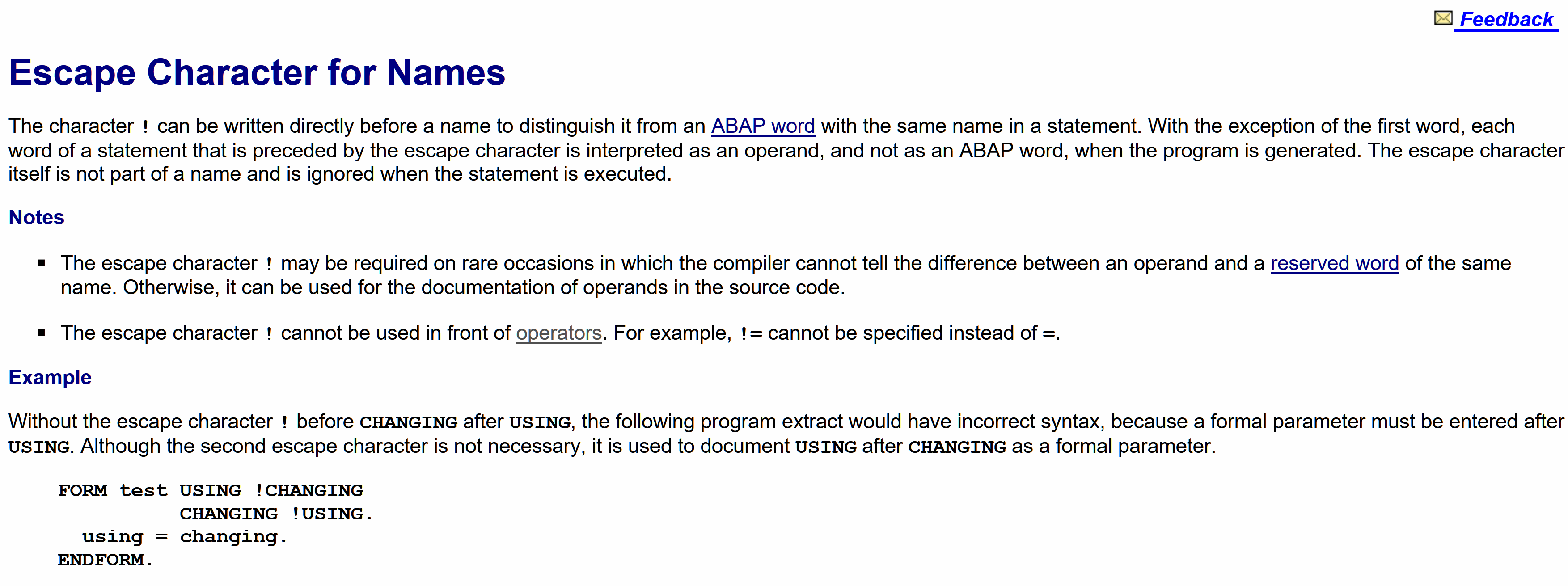 ABAP 里的感叹号作为 escape 字符,用以区别于 ABAP 语句中同名的ABAP keyword. ABAP 语句中前面带有 ! 字符的每个单词都被解释为一个操作数,而不是一个 ABAP keyword. 转义字符本身不是名称的一部分,在执行语句时会被忽略。